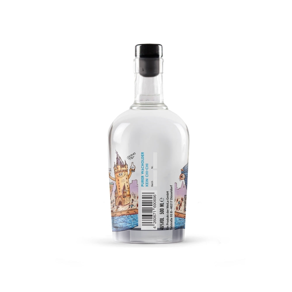 Als eine Hommage an die Stadt Frankfurt haben wir gemeinsam mit dem Künstler Jacques Tilly eine besondere Edition unseres ansonsten puristischen r[h]eingins gestaltet. Das weltstädtische Lebensgefühl der Mainmetropole lassen wir durch einige imposante Bauwerke der eindrucksvollen Skyline aufleben: So schmücken die Europäische Zentralbank, die Alte Oper, der Messeturm, der Omniturm, der Commerzbank Tower, der Main-Tower, der Römer, der Eiserne Steg, die Paulus Kirche, der Eschenheimer Turm und die Bankenstadt die Flasche. Jeder Gin Flasche wird von Hand beschriftet und erhält somit eine individuelle Flaschennummer.