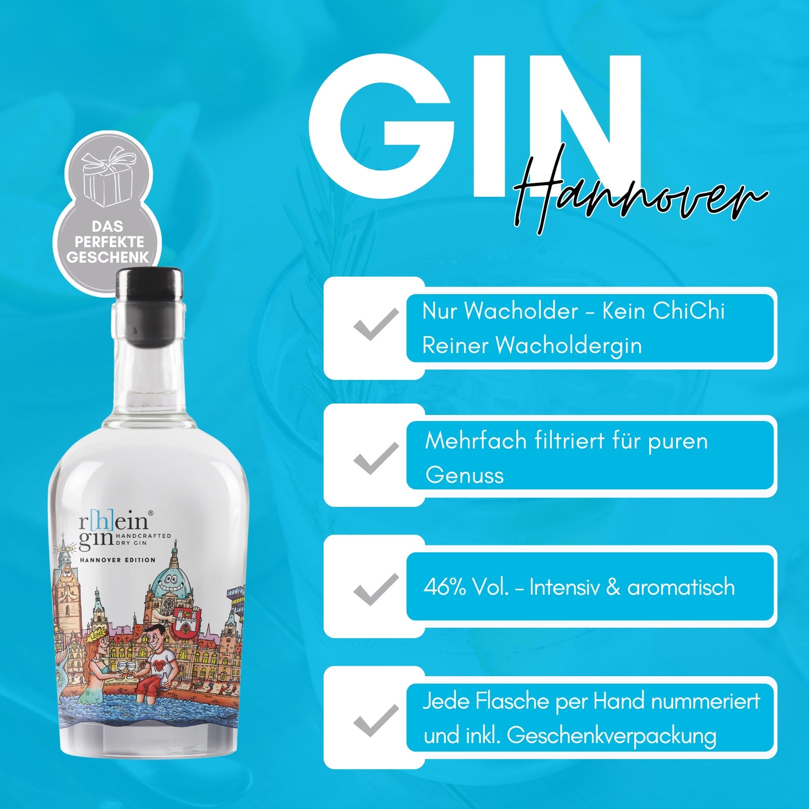 Als eine Hommage an die Stadt Hannover haben wir gemeinsam mit dem Künstler Jacques Tilly eine besondere Edition unseres ansonsten puristischen r[h]eingins gestaltet. Das einzigartige Lebensgefühl der Stadt in Niedersachsen lassen wir durch einige beeindruckende Bauwerke aufleben: So schmücken der Gehry Tower, die Nanas am Leibnizufer, die Kröpcke-Uhr, der VW-Tower, die Marktkirche, das Neue Rathaus, die Norddeutsche Landesbank sowie das Alte Rathaus und die berühmte Hannover Messe die Flasche. Jeder Gin wird von Hand beschriftet und erhält somit eine individuelle Flaschennummer.